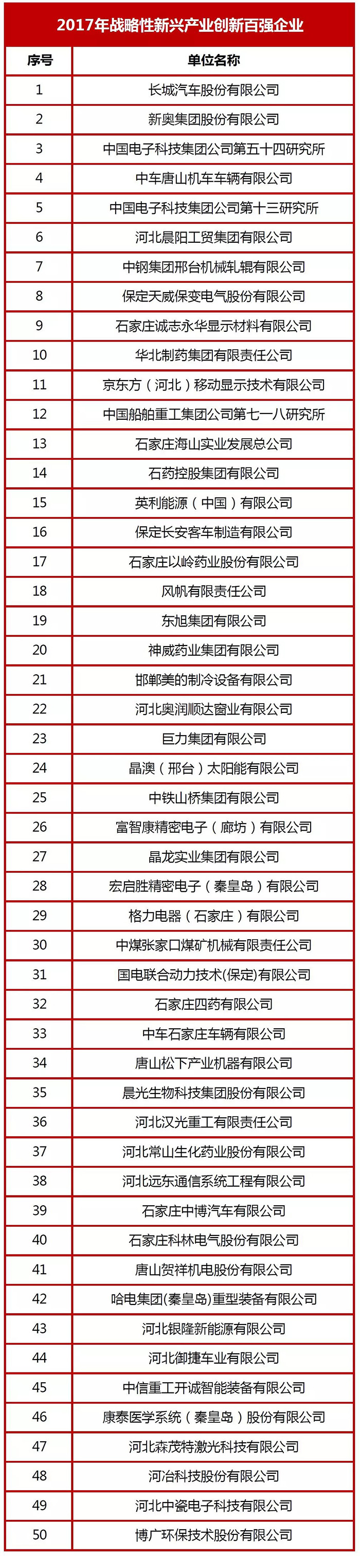 近日,按照河北省戰略性新興產業發展三年行動計劃部署要求,省發展改革委、省工業和信息化廳、省科技廳聯合發布了2017年河北省戰略性新興產業百強領軍企業和創新百強企業名單。