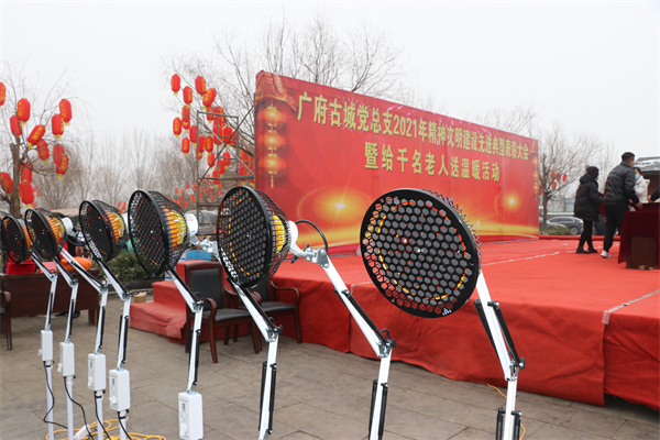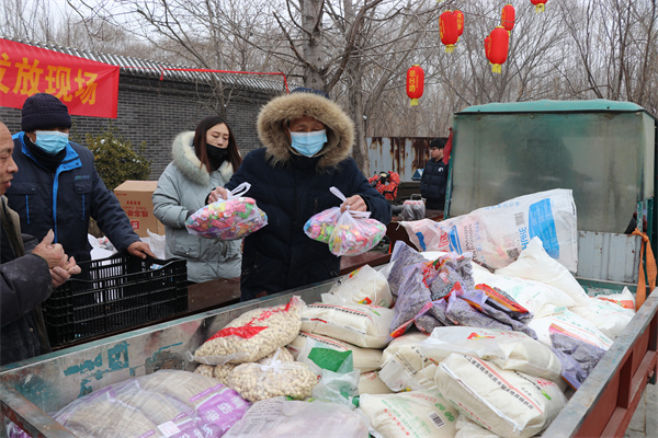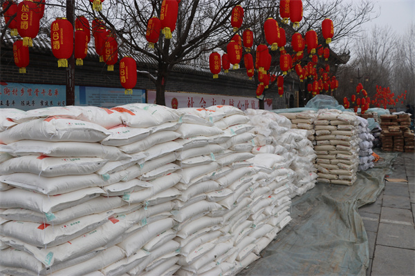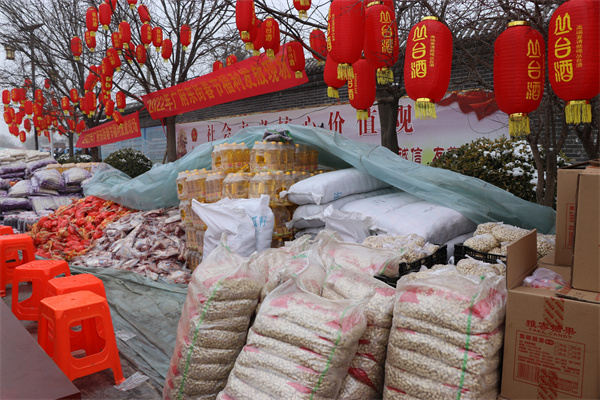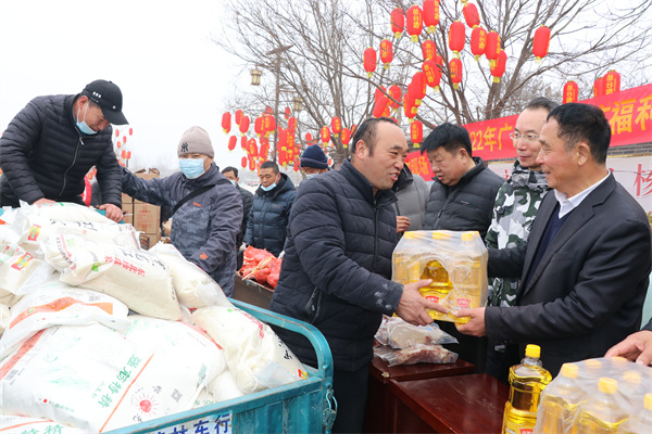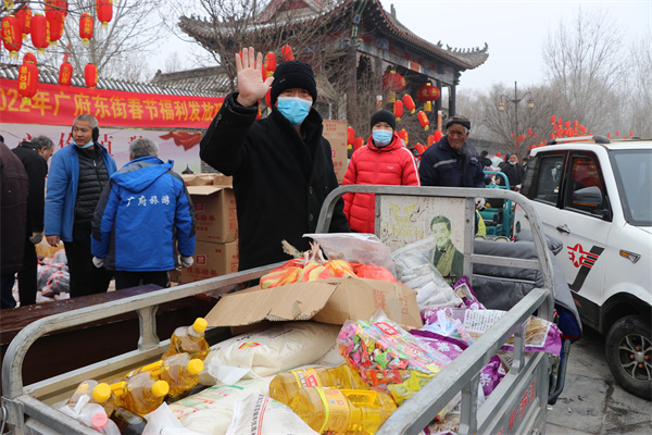 1月25日,永年區廣府古城東街村村民在村委會門口上排起了長龍隊,甘露寺廣場上亦是搭起了舞臺,臺下坐滿了70歲以上老人,現場每一個人們臉上都洋溢著燦爛的笑容。東街村委會門口兩旁,整齊地碼著米、面、油、肉、糖等十幾種年貨,今年是東街村黨支部書記宋福如為村民置辦年貨的第十三個年頭。據悉,今年為村民置辦的年貨種類達12樣之多:2斤帶魚、1只白條雞、2斤豬肉、1桶色拉油、1瓶香油、20斤大米、20斤精粉、10斤餃子粉、1袋糖塊、1袋瓜子、1袋花生、1袋粉條,讓全村人過春節不用再花一分錢。在保證村民日常需求之外,讓村民新年品嘗新味道,讓東街村新年充滿新氣象!